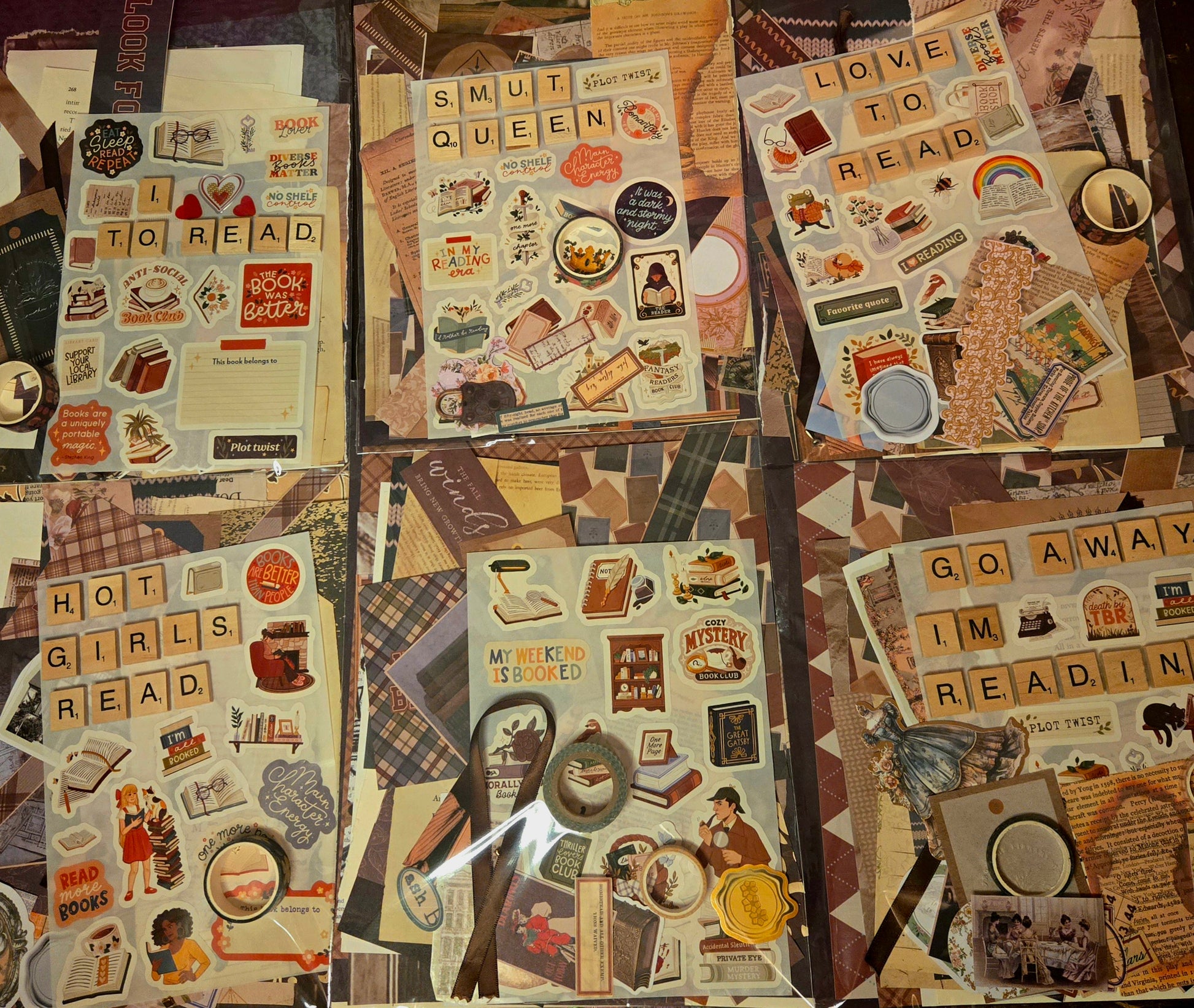 This book themed Inspiration Pack includes an assortment of patterned papers, stickers, book pages and washi tape.