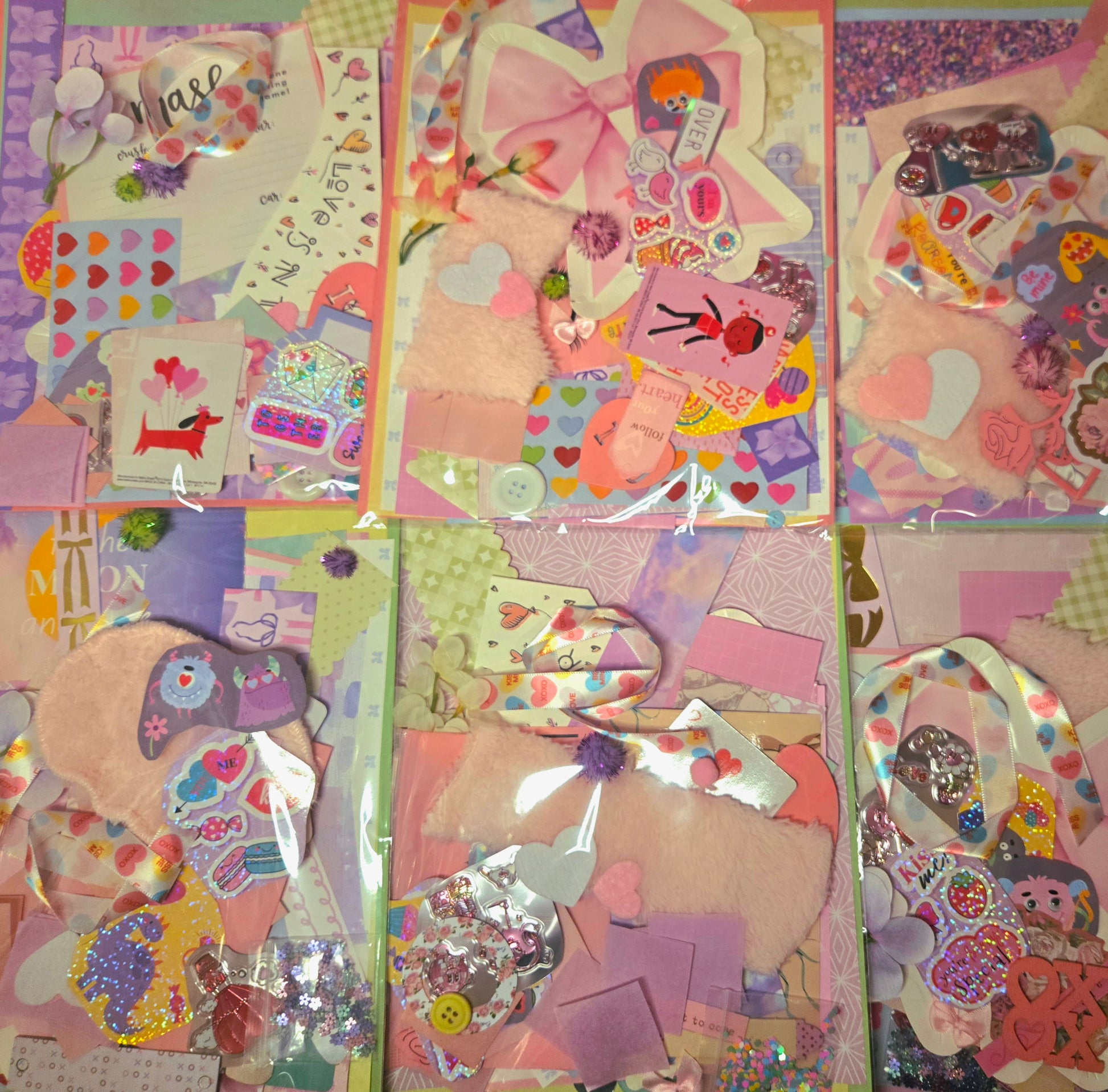 This pastel Valentine's themed Inspiration Pack includes an assortment of patterned papers, stickers, fabric, ribbon and wooden elements.
